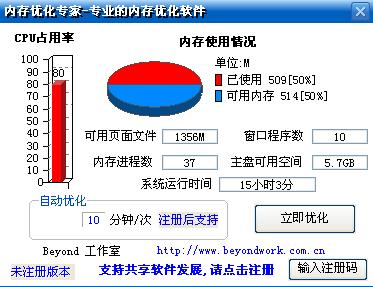 注册后即可自动优化内存 注册后 界面上注册按键会自动消失. ------------------签名------------------- Beyond 工作室 枫 |